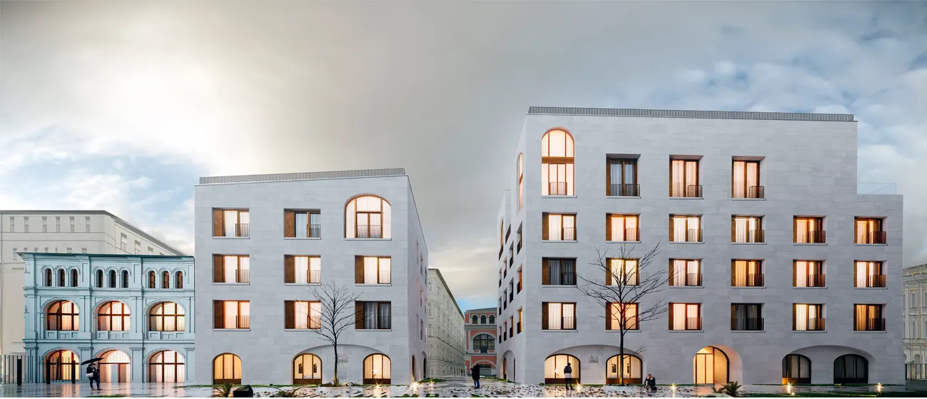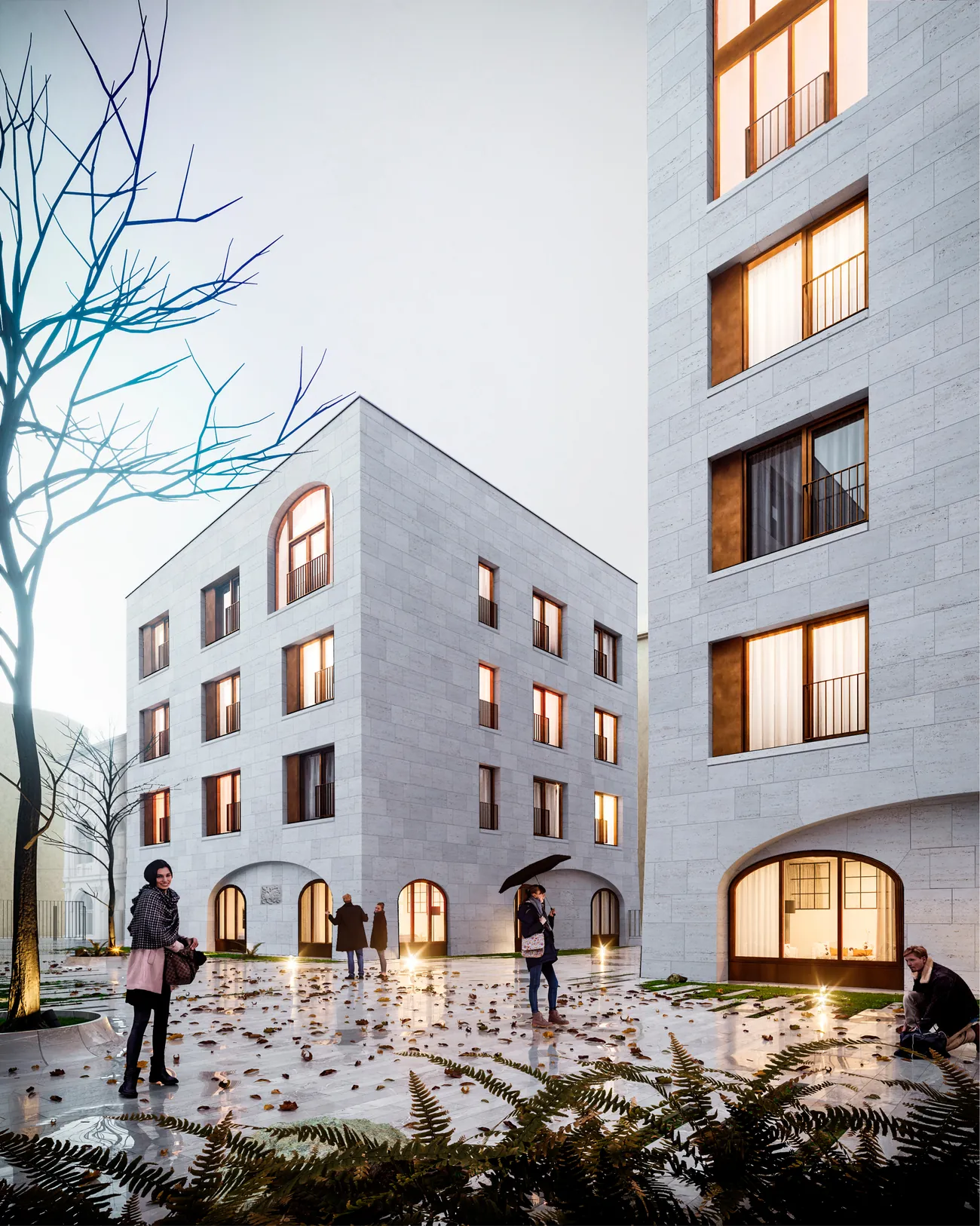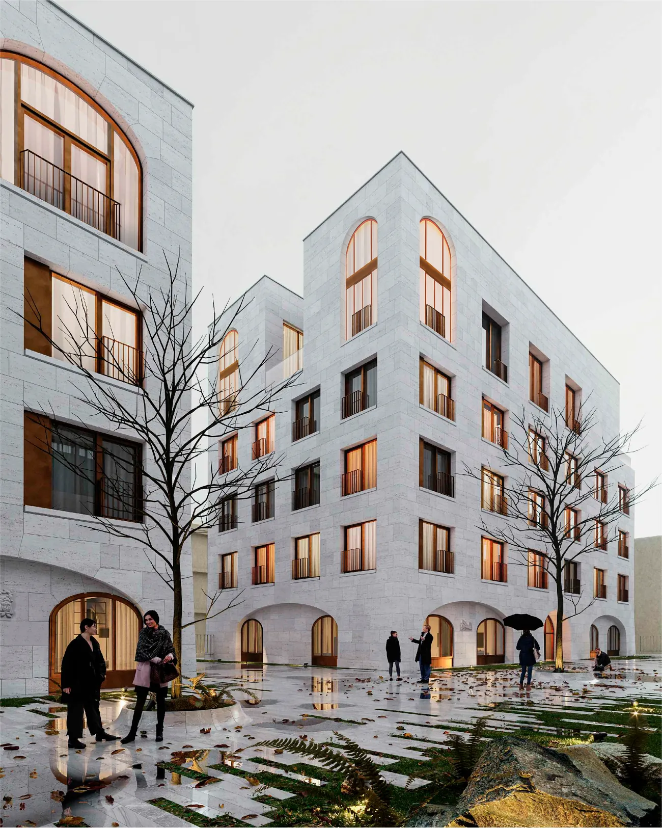 The primary challenge lays within the complex process of integrating 19th-century buildings with contemporary residences. The architectural solution focused on preserving historical identity while creating an elite residential environment with the highest level of comfort. The facades of the new buildings are clad in granite, with the ground floor designed with a characteristic "skirt" slope, harmonising the ensemble with the historic surroundings. Arched openings and glazed facades echo the architectural language of the restored mansions. Glass-enclosed passages provide an organic link between the new and historic volumes. Each residence features private patios and landscaped terraces, creating the atmosphere of a secluded home in the very heart of the metropolis.