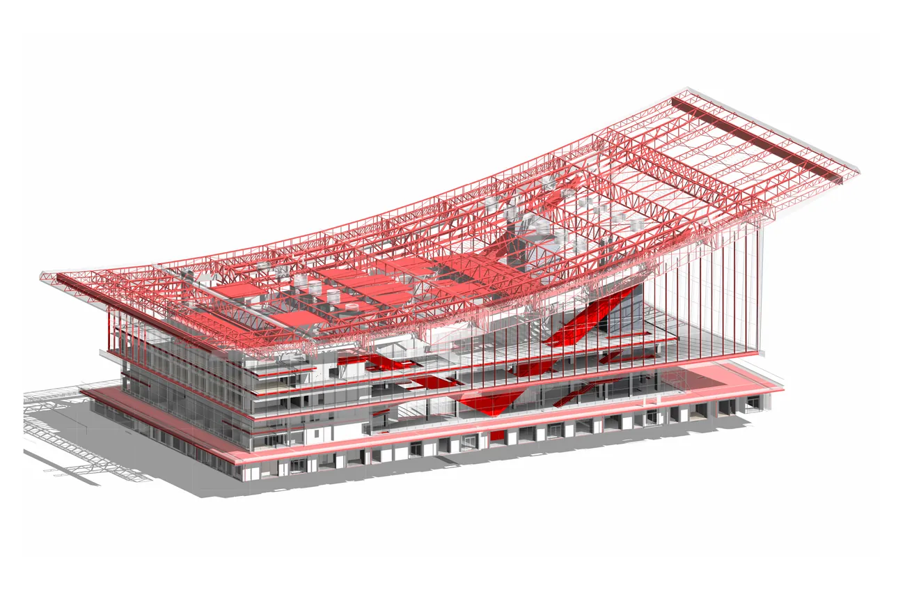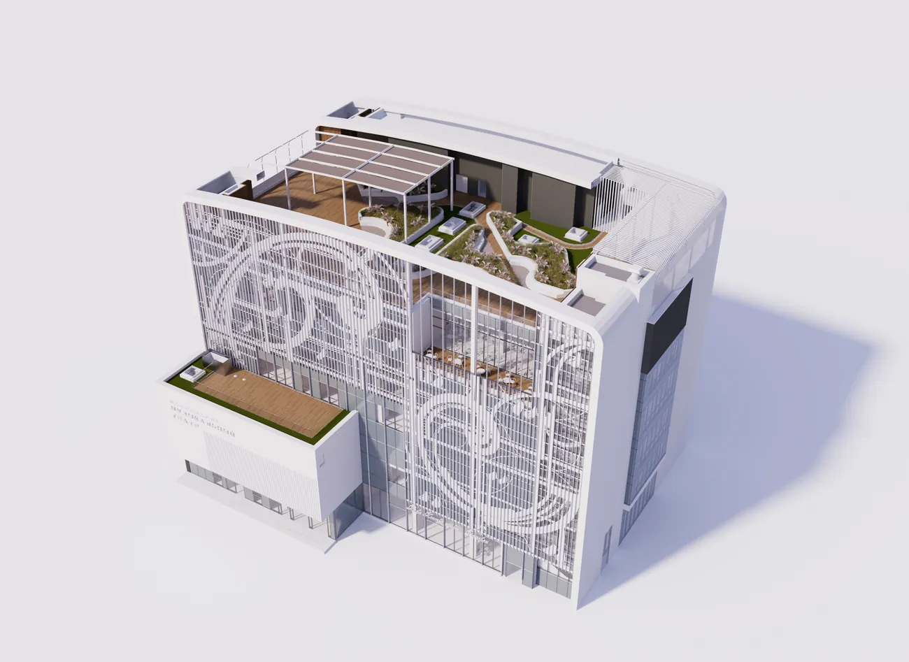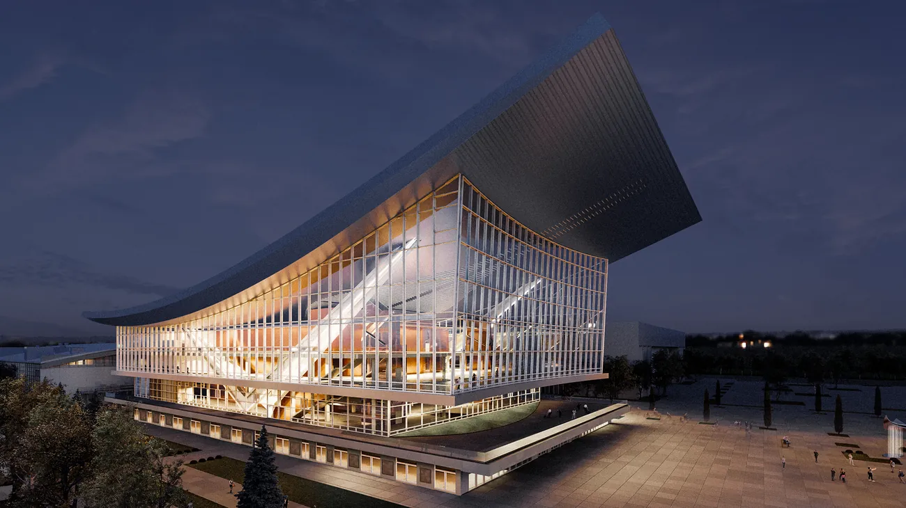 The main facade is conceived as a dynamic "theatrical curtain": a glass system with decorative lamellas and a silkscreen pattern that comes to life in motion. Evening light enhances the effect, turning the building itself into a spectacle.