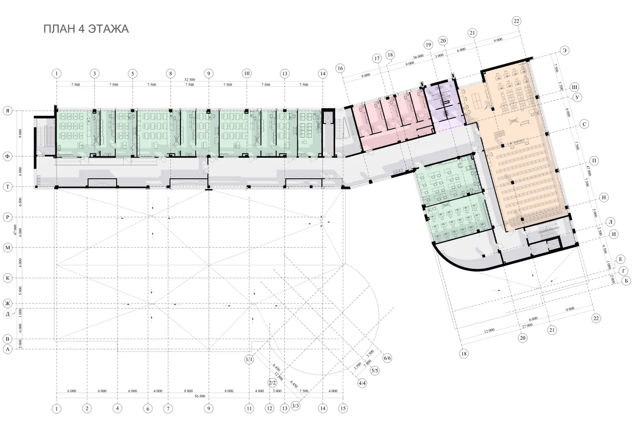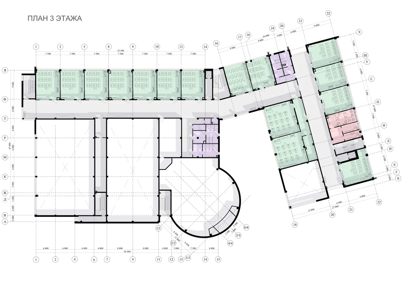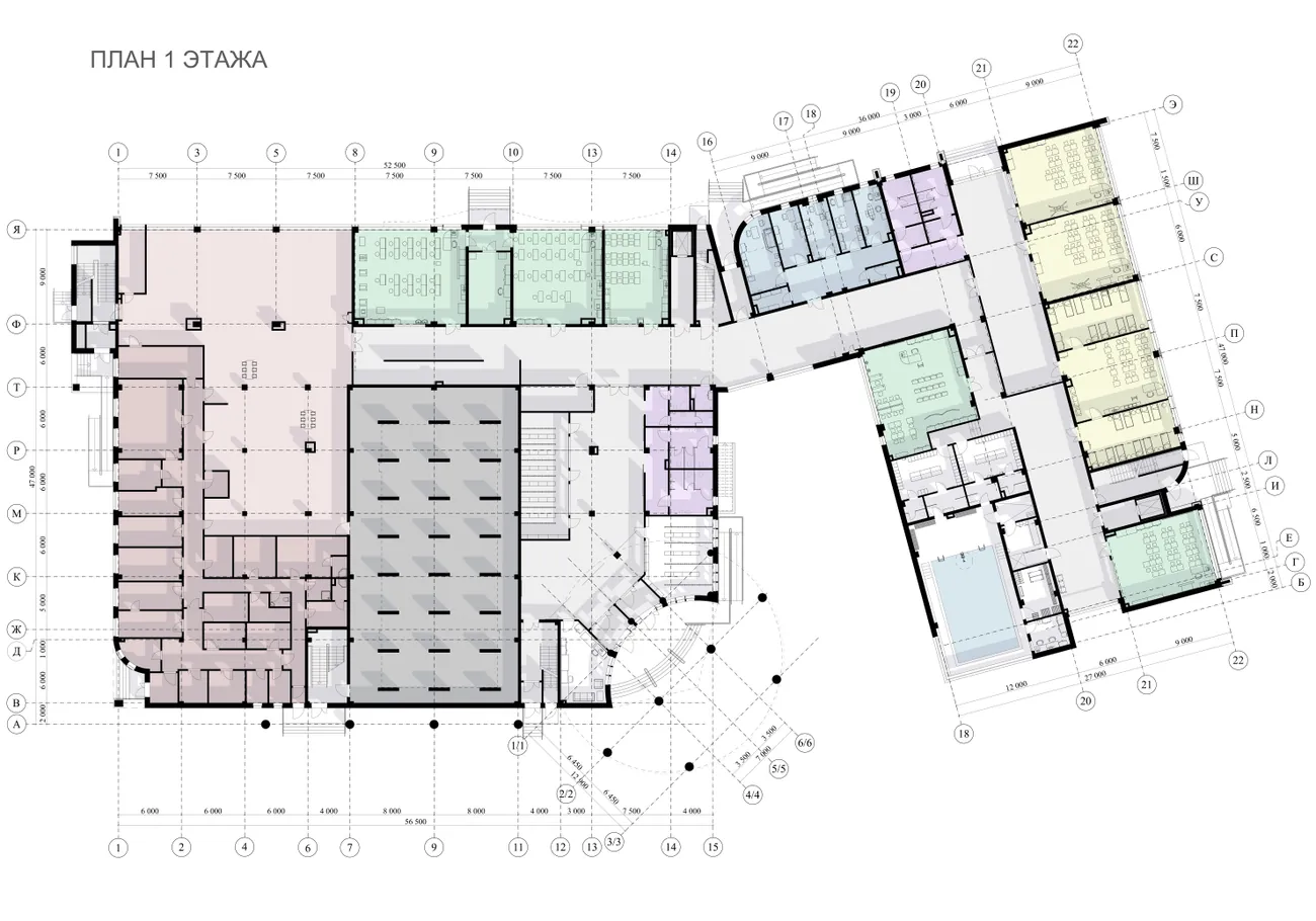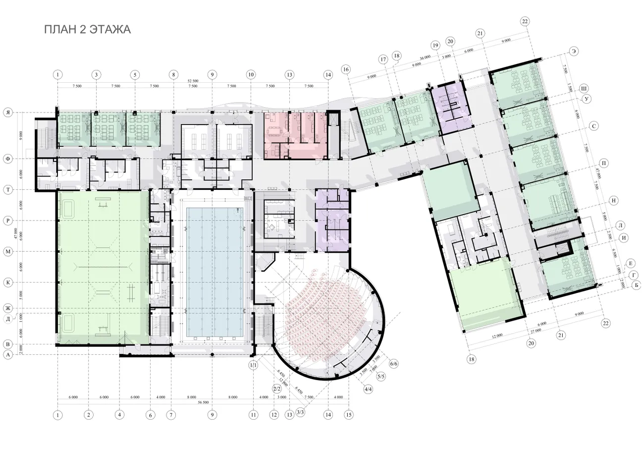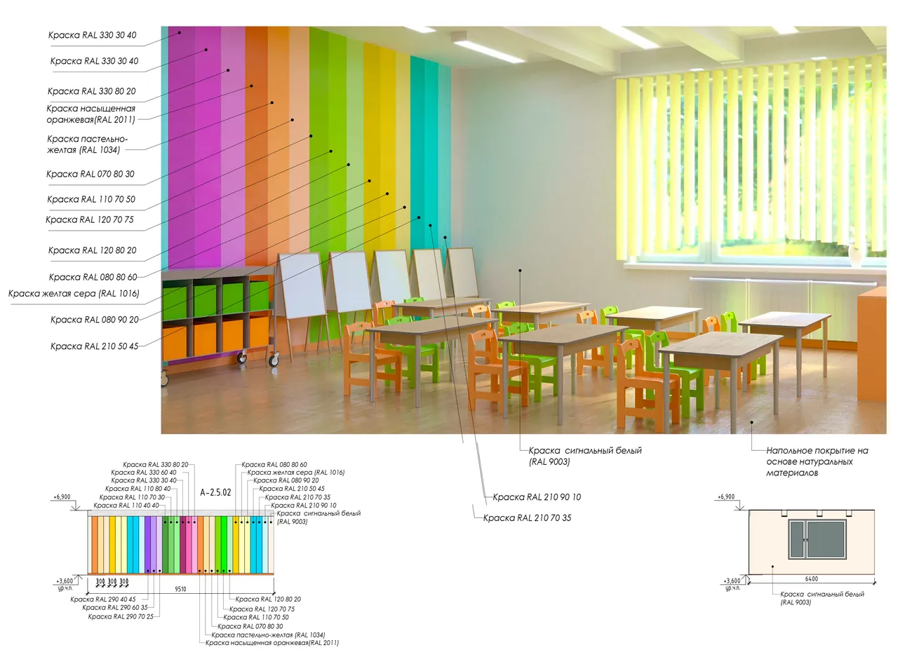 In public buildings, the key tasks were functional organisation of space and compliance with regulatory standards. Special focus was given to the design of a secondary school in St. Petersburg and the development of a preschool interior project, including regulatory calculations of insolation and natural lighting (daylight factor).Responsibilities