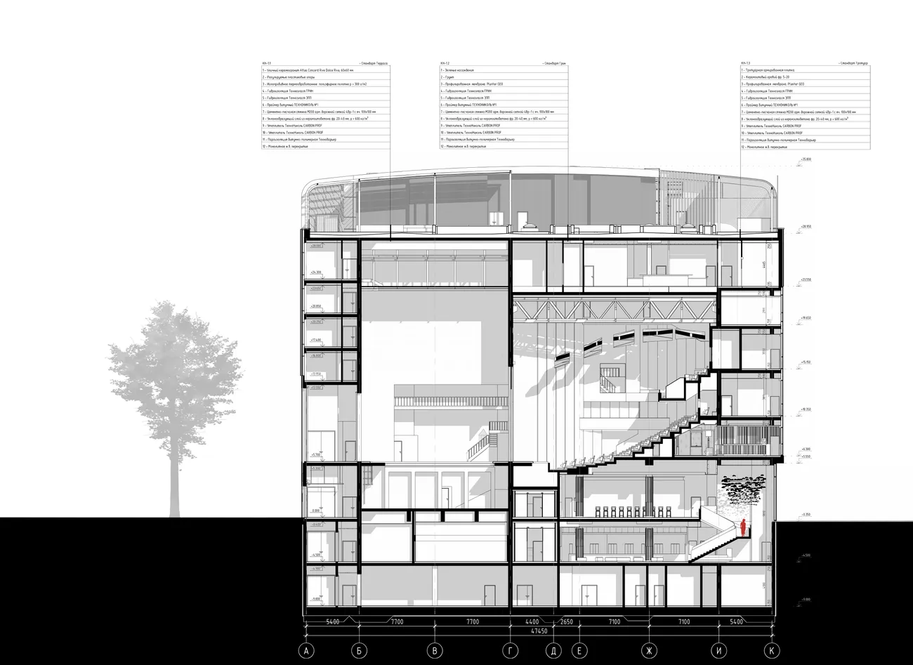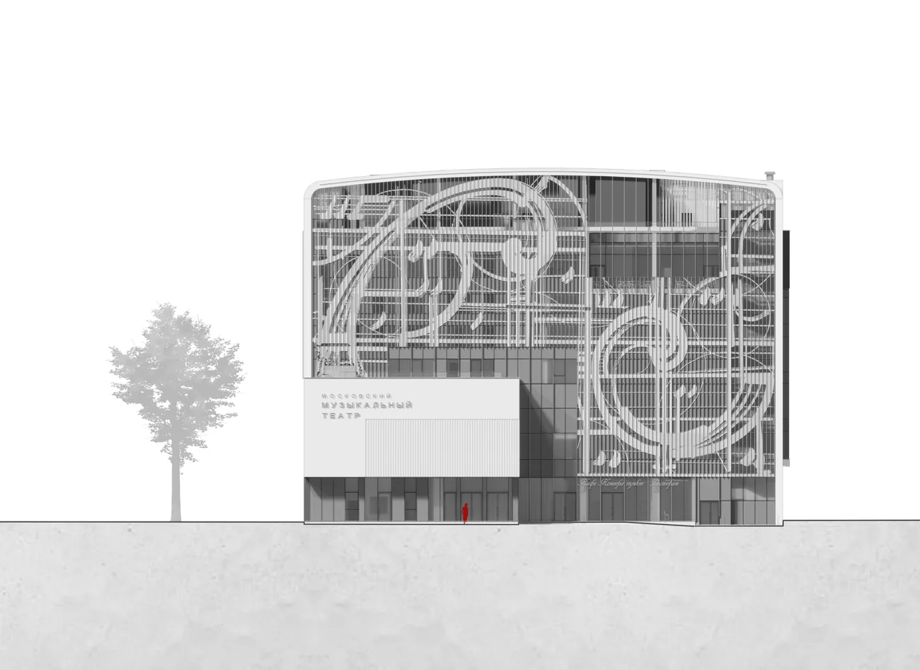 The design of the new theatre was shaped largely by the challenging conditions of the site: its limited dimensions, proximity to neighbouring buildings, and the strict regulations of the protected zone. These constrains defined the vertical composition, which references the silhouette of the lost landmark of the Hermitage Garden - the Shchukin Stage. The building integrates perfectly into the surrounding theatre cluster while maintaining its individuality, becoming a new architectural focal point of the garden.