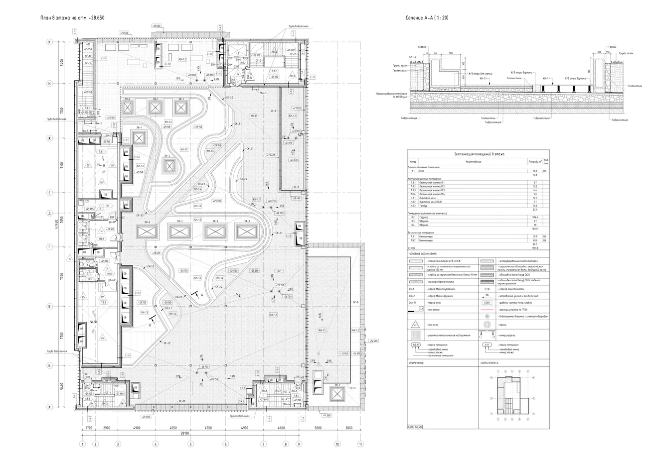 The key work principal is careful approach to heritage. The main historical elements are: the V-shaped supports, the roof, and the glass facade. They are being preserved and reconstructed based on 1967 archival data. Additionally the pavilion obtains a modern "warm" envelope, in contrast to the original "cold" construction.